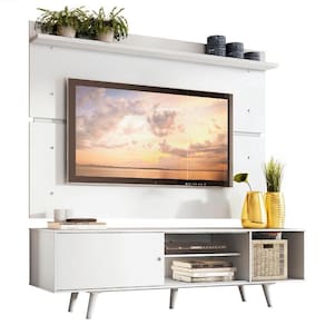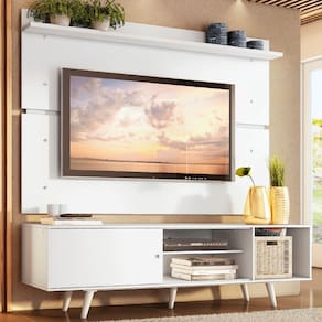 O painel comporta TV de até 65 polegadas e contempla uma prateleira na parte superior, perfeita para objetos decorativos. Por ser separado do rack, pode ser fixado na altura desejada.
