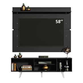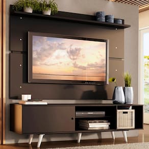 O painel comporta TV de até 65 polegadas e contempla uma prateleira na parte superior, perfeita para objetos decorativos. Por ser separado do rack, pode ser fixado na altura desejada.