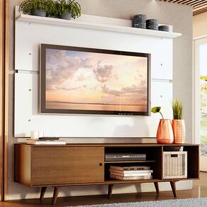 O painel comporta TV de até 65 polegadas e contempla uma prateleira na parte superior, perfeita para objetos decorativos. Por ser separado do rack, pode ser fixado na altura desejada.