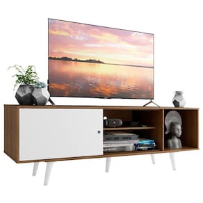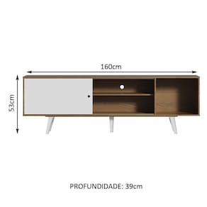 O acabamento do rack é no padrão amadeirado Rustic. A porta e os pés são brancos. O processo é feito em Poliéster Protetor com 7 camadas, detalhe que confere mais durabilidade e qualidade aos produtos. Além disso, é ecológico, isento de vapores prejudiciais à atmosfera.