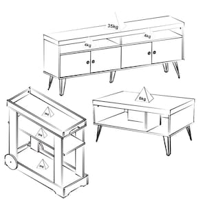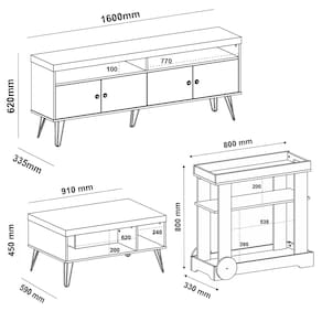Características adicionais: Rack: Tampo em Tamburato de 50mm que suporta TVs até 65 polegadas, 2 passa fios, 4 portas com dobradiças metálicas, Amplo espaço para objeto e eletrônicos, 5 pés metálicos; Carrinho de Bar: Detalhe usinado, fita de borda metalizada, amplo espaço para bebidas, copos e acessórios, Rodas estilizadas em MDF, 4 rodízios.