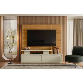 Possui 2 gavetas com corrediças telescópicas e entrada para TV de 1,800m x 1,185m. Seu sistema de montagem Girofix garante praticidade, enquanto o design minimalista, sem pés ou puxadores, mantém o ambiente elegante e organizado.