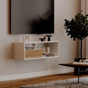 Com design compacto e sofisticado, ele ocupa pouco espaço, deixando sua sala ou quarto mais harmônicos. Possui compartimentos abertos para objetos decorativos e um compartimento fechado com porta, garantindo praticidade e discrição no armazenamento do dia a dia.
