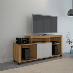 O Rack Ouro Proporciona toda qualidade e organização à sua sala, um produto belo e compacto, confere ao ambiente um ar sofisticado e moderno. Possui espaço para eletrônicos, porta em MDF com detalhe em frisos, rodízios aparentes, espaço para TV: 120cm x Livre (LxA), Recomenda-se TV até 43 polegadas.