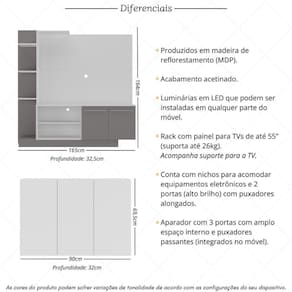 Produzido em MDP de 15mm com acabamento acetinado (20% de brilho), este conjunto garante durabilidade e resistência excepcionais. O rack com painel conta com luminárias em LED que, além de fáceis de instalar em qualquer parte do móvel, trazem um visual moderno e convidativo. Com luz brilhante e alimentadas por 3 pilhas AAA, elas são a combinação perfeita de praticidade e estilo.