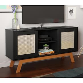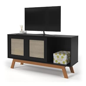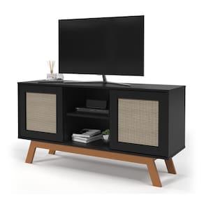 Além de ser produzido em MDF de 15mm, O Rack possui 2 Portas de Correr com Detalhe Rattan Sintético, 1 Prateleira e Pés em Madeira Pinus.