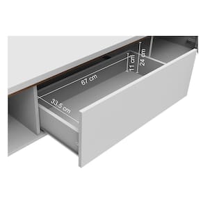 O design conta com duas portas laterais e uma gaveta central com corrediças metálicas, oferecendo amplo espaço para guardar livros, eletrônicos, acessórios e objetos decorativos, mantendo tudo sempre à mão.