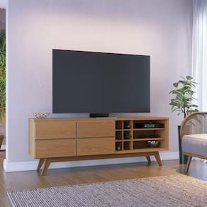 Rack Para Sala Bancada De Tv 70 Pol 180cm Cinthia C04 - D'rossi Cor Freijó Se você procura uma bancada sofisticada e versátil para complementar a decoração da sua sala de estar, acabou de encontrar a opção perfeita! O Rack Bancada Cinthia une beleza e praticidade em um único móvel, garantindo um ambiente moderno e organizado. Projetado para se adaptar a diferentes espaços, como salas de estar, escritórios e áreas de entretenimento, esse rack para TV de até 70 polegadas oferece muito mais do que suporte para seus aparelhos. Ele conta com nichos espaçosos para eletrônicos, duas portas com sistema de abertura fecho toque, detalhes chanfrados e bordas com pintura PU. que garantem armazenamento discreto para seus objetos e um nicho adega para 06 garrafas com montagem opcional, ideal para quem gosta de sofisticação nos detalhes. Os frisos decorativos nas portas complementam o design contemporâneo, agregando charme e requinte ao ambiente. Não deixe essa oportunidade passar! Adicione agora mesmo ao seu carrinho e transforme sua sala com estilo e funcionalidade!Dimensões do Produto: Altura: 64 cm Largura: 180 cm Profundidade: 36,5 cm Altura dos Pés: 20 cm Peso: 44,5 kg Características do Produto: Material da Estrutura: MDP 15mm/25mm Acabamento: UV Revestimento: Pintura Escala de Brilho: Fosco Revestimento da Borda: Fitas de borda em papel Peso Suportado: 47 kg distribuídos Suporta TV de até: 70 Polegadas Possui Portas: Sim Quantidade de Portas: 2 Portas Tipo de Porta: Convencional de giro Material da Dobradiça: Metálica | Fecho Toque Possui Prateleiras: Sim Quantidade de Prateleiras: 2 Prateleiras Possui Nicho: Sim Quantidade de Nicho: 9 Nichos Possui Pés: Sim Quantidade de Pés: 4 Pés Material dos Pés: Madeira maciça Possui Passa Fios: Sim Possui Adega: Sim Quantidade de Nicho Adega: 6 compartimentos Possui Rodízios: Não Possui Gavetas: Não Necessita Fixação na Parede: Não Diferenciais: Design moderno; Detalhes chanfrados nas portas; Portas com fecho toque; Adega para até 6 garrafas. Sistema de Montagem: Parafusos/Cavilhas/Minifix Manual de Montagem: Sim Complexidade da Montagem: Média Montagem: Recomendamos que seja feita por um Garantia: 90 dias contra de fabricação Instruções de Limpeza: Utilizar um pano limpo e levemente úmido Quantidade de Volumes 2 Caixas Medida das Embalagens Caixa 1: 12 cm x 36,6 cm x 186,8 cm e Caixa 2: 6,9 cm x 41,6 cm x 54,8 cm : É feita somente até o térreo ou portaria. Não levamos em andares superiores. Confira sempre as medidas das embalagens.