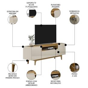 Características do Produto Material da estrutura: MDP/MDF. Acabamento: Pintura UV. Escala de Brilho: Fosco/Brilho. Peso Suportado: 45 kg distribuídos. Suporta TV de até: 75 Polegadas. Quantidade de Portas: 3 Portas. Tipo de Portas: 2 Convencional, 1 Basculante. Tipo de Dobradiças: Metálicas/Pistão a gás. Possui Gavetas: Não. Tipo de Puxadores: Passante. Quantidade de Prateleiras: 1 Prateleira. Quantidade de Nichos: 1 Nicho. Possui Passa-Fios: Sim. Possui LED: Não. Possui Pés: Sim. Tipo de Pés: Madeira Maciça. Diferenciais: - Design moderno. - Pés estilo retrô em madeira maciça. - Tampo de 25mm. - Portas com detalhe arredondado e puxador passante. Sistema de Montagem: Parafusos/Cavilhas/Minifix. Manual de Montagem: Sim. Complexidade da Montagem: Média. Volumes: 1 Volume. Conteúdo da Embalagem: 1 Rack. Garantia do Fabricante: 90 dias contra defeito de fabricação. Montagem: Recomendamos que seja feita por um profissional. Recomendação de Limpeza: Utilize pano levemente úmido.