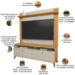 Esse rack moderno impressiona com pés em madeira maciça chanfrada, um detalhe exclusivo que traz robustez e elegância. Já o painel para TV é o complemento perfeito, oferecendo espaço extra ajustável para suas necessidades, seja para expor decorações, livros ou itens de uso diário, seja para instalar a TV de até 55 polegadas. Em outras palavras, praticidade e design impecável, lado a lado, para transformar sua sala em um cenário digno de revista.