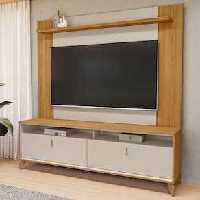 Esse rack moderno impressiona com pés em madeira maciça chanfrada, um detalhe exclusivo que traz robustez e elegância. Já o painel para TV é o complemento perfeito, oferecendo espaço extra ajustável para suas necessidades, seja para expor decorações, livros ou itens de uso diário, seja para instalar a TV de até 55 polegadas. Em outras palavras, praticidade e design impecável, lado a lado, para transformar sua sala em um cenário digno de revista.