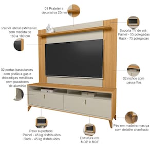 Espaço útil para TV no rack: 182 x 107 x 38 cm.