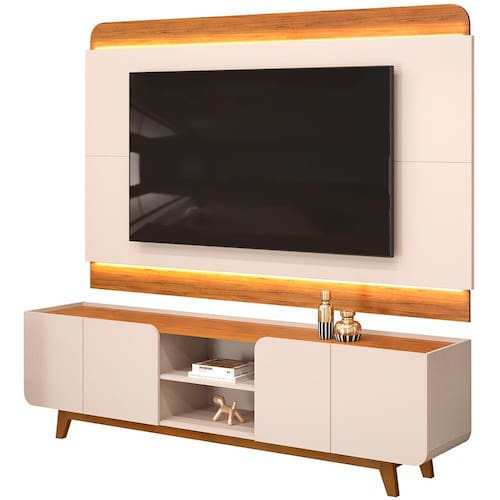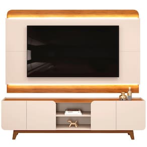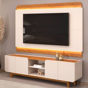 Para que escolher entre rack e painel se você pode ter os dois e deixar a sua sala de estar completa?! Sim, com o Rack Para Sala com Painel Para TV 75 Pol LED Cine D05 Off White Freijó, da Lyam Decor, você terá o combo de funcionalidade e estilo. O rack bancada com o tampo rebaixado cria o efeito de bandeja, enquanto os cantos curvos dão um toque de modernidade. Por sua vez, a funcionalidade fica por conta das quatro portas, já que garantem um amplo espaço interno para armazenar seus objetos e, assim, manter tudo organizado e no lugar. Além disso, os dois nichos e a prateleira entre as portas foram projetados intencionalmente para dispor os demais aparelhos eletrônicos ou até mesmo itens decorativos. Para completar, o painel para TV suporta até 75 polegadas, além de receber destaque com as fitas de LED, que criam um ar acolhedor e convidativo. Um conjunto para sala lindo de se ter, não é mesmo?! Então, aproveite momentos de entretenimento com muito estilo com o Rack e Painel Cine. Garanta já o seu!