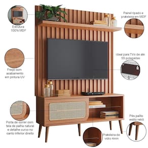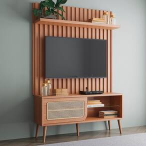 Com um design moderno, o painel ripado não apenas emoldura sua de até 55 polegadas, como também adiciona um toque de textura que encanta os olhos. A funcionalidade se une à estética com o rack para sala, que oferece espaço suficiente para organizar seus equipamentos e exibir suas decorações favoritas, sem contar que o detalhe da porta em palha natural proporcionam um contraste delicado, elevando o estilo do ambiente, enquanto os pés palito garantem uma leveza que não ocupa muito espaço visual.