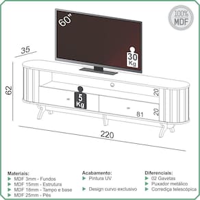 Ideal para de até 60 polegadas sobre o tampo.