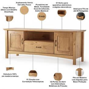 Com 02 portas, 01 gaveta e um nicho espaçoso, você guarda todos os seus aparelhos eletrônicos, controles e acessórios com discrição e fácil acesso. Além disso, esse rack para sala é todo fabricado em madeira maciça com acabamento verniz carvalho fosco, ou seja, ele oferece uma durabilidade incomparável e um visual rústico-moderno. Para completar, os detalhes do tampo chanfrado e dos puxadores em metal medieval completam o look de requinte.