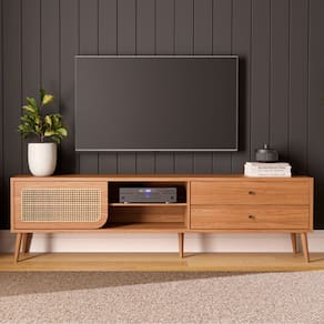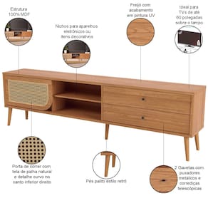 Fabricado 100% em MDF, esse rack bancada conta com uma porta de correr adornada por uma tela natural, que agrega um toque vintage que transforma o ambiente. Já as duas gavetas oferecem espaço generoso para manter tudo organizado, enquanto o tampo robusto serve perfeitamente para acomodar TVs de até 60 polegadas, unindo praticidade ao estilo. As linhas clássicas, combinadas com os pés estilizados, fazem deste rack retrô um verdadeiro ícone na decoração, ideal para quem valoriza um lar acolhedor e cheio de personalidade.