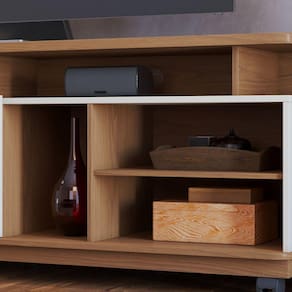 01 prateleira e 05 nichos para dispositivos eletrônicos e itens decorativos.