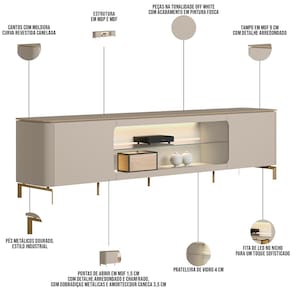 O painel para TV, com seus detalhes curvos canelados, suporta TVs de até 85 polegadas. Já o rack bancada, com tampo em MDF e pés metálicos dourados que evocam o charme industrial, complementa a elegância do ambiente. Os nichos centrais com LED, além de embelezar com um toque único, também são ideais para organizar aparelhos eletrônicos e itens decorativos, enquanto as fitas de LED nas laterais do painel adicionam um toque mágico à sua sala, criando um espaço acolhedor para momentos especiais.