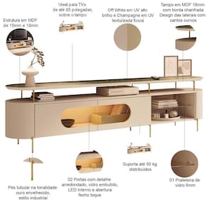 O painel suspenso impressiona com seu design fluido, cantos arredondados e LED integrado, além de comportar TV de até 85 polegadas, enquanto o rack bancada equilibra curvas suaves e estrutura tubular metálica, com um toque luxuoso no detalhe dourado, bem como as portas e prateleira em vidro adicionam leveza e sofisticação. Para completar é um rack com painel 100% em MDF, o que garante resistência e durabilidade. Não espere mais, adicione ao seu carrinho e aproveite!