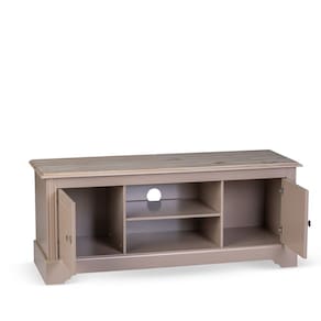 Transforme sua sala de estar com este elegante rack de madeira, que une funcionalidade, beleza e qualidade artesanal. Com design contemporâneo e atemporal, ele possui duas portas laterais com amplo espaço interno para organização, além de nichos centrais ideais para eletrônicos, decodificadores ou objetos decorativos.