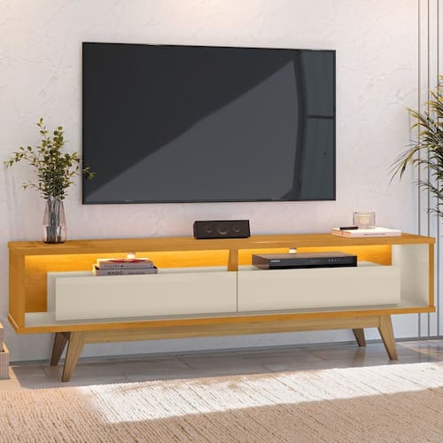 Com design contemporâneo e toque retrô, ele combina funcionalidade e elegância. As duas gavetas espaçosas ajudam a manter tudo organizado, enquanto a iluminação em LED cria um clima sofisticado e acolhedor, perfeito para suas noites de filme.