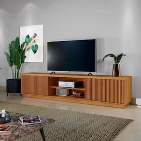 O rack Valencia é uma opção linda e super versátil que traz portas com detalhe ripado e prateleiras centrais, além de amplo espaço no tampo.