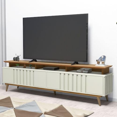 O móvel dispõe de quatro portas e diversos nichos, oferecendo ampla capacidade de armazenamento para dispositivos eletrônicos, acessórios e itens decorativos. As portas e laterais do rack contam com detalhes ripados que não só enriquecem o visual, como também proporcionam uma textura agradável ao toque.