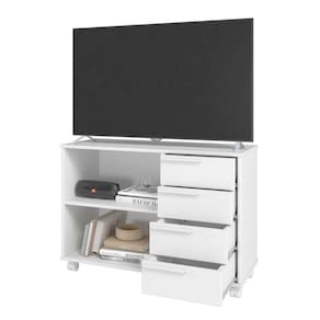 Características: Estrutura: MDP 4 Gavetas Corrediças metálicas 1 Prateleira 4 Puxadores Com Rodízios Peso suportado: 31kg Suporta TV até 40 Polegadas