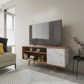 O RRack para TV até 42 Polegadas 1 Porta com Pés Palito R1486 Tecno Mobili, Com um design elegante, ele possui pés palito cônicos que trazem charme e estilo ao ambiente. Suas duas prateleiras laterais amplas são perfeitas para organizar objetos e dar um toque decorativo ao espaço. Além disso, o rack conta com uma porta de abrir com detalhes em sobre cor, garantindo um visual diferenciado e moderno.