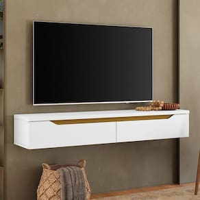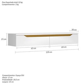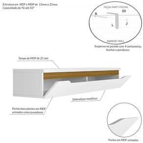 O Rack Suspenso Uno 1350mm é um produto com um design diferenciado, possui duas portas basculantes usinadas para servir de puxadores e uma vista amadeirada. Sua estrutura é em MDF e MDP de 15 e 25 mm, possui dois compartimentos internos. É um produto que você poderá instalar na parede de qualquer ambiente, no estilo contemporâneo, personalizando e deixando-o exclusivo. Produto Montado: Sim Acabamento: Acetinado Acabamento da Porta: Pintura UV codigo_ean: 7900288098696 Complexidade da Montagem: Alta: deve ser montado por um montador especializado Cor: Branco Ac/ Cedro Fj Ac Cor da Caixa: Branco Cor da Porta: Branco Cor do Produto: Branco Ac/ Cedro Fj Ac Cor Flex: Não Cor Interna: Branco Ac Escala de Brilho: Semi-Brilho Escala de Brilho da Porta: Semi-Brilho Ideal para TVs até (Polegadas): 50 Itens Inclusos: 1 Rack, 1 Kit Ferragens, 1 Manual de Montagem Manual de Montagem e Instalação: https://product-hub-prd.madeiramadeira.com.br/983013/documents/cdd70147-23f3-49b7-a72a-ac38210768552763167438717429286804666.pdf Marca: Olivar Material da Porta: MDF Material Principal: MDP Montagem Flex: NÃO Necessita Montagem: Sim Origem do Produto: Nacional Peso: 15 kg Possui Adega: Não Possui Espelho: Não Possui iluminação: Não Possui Passa Cabos: Não Possui Pés: Suspenso Possui Prateleiras: Não Possui Vidro: Não Recomendações de Uso, Manutenção e Limpeza: Pano úmido. Não aplicar lustra móveis. Sistema de Montagem: PARAFUSOS E MINIFIX Tipo de Puxador da Porta: Embutido