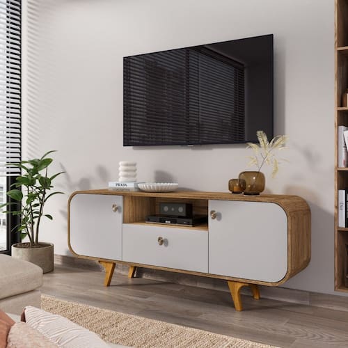 Rack para TV Até 55 Polegadas 2 Portas 1 Gaveta com Pés de Madeira Maciça Noronha Bechara, com elegância e funcionalidade este rack de design moderno e sofisticado, que se adapta a qualquer decoração. Ele oferece amplo espaço com nichos para eletrônicos e objetos decorativos, garantindo um ambiente aconchegante e organizado.