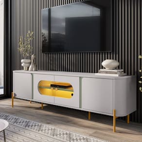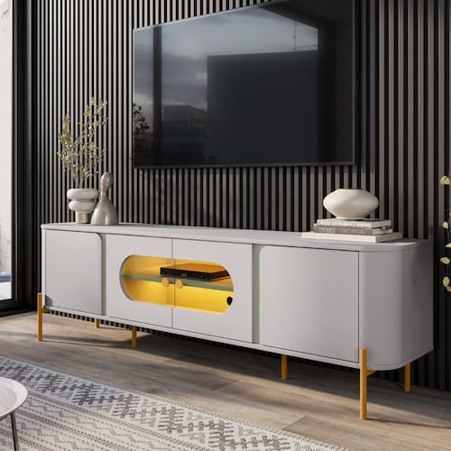 Rack para TV Até 55 Polegadas com LED e Vidro Reflecta 4 Portas com Pés Juquehy Bechara, combina sofisticação e funcionalidade com sua dupla iluminação de LED, que destaca os detalhes do ambiente de forma suave. Os vidros reflecta trazem um toque moderno e elegante, equilibrando privacidade e estética. Sua estrutura é durável, com pés em aço pintados de epóxi anti ferrugem, resistentes ao tempo e à umidade. O design orgânico, com linhas fluidas, se adapta a diversos estilos de decoração, enquanto as dobradiças soft close garantem um fechamento silencioso e suave, proporcionando conforto no uso diário.