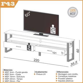 Características: Estrutura 100% MDF Acabamento em Pintura UV 02 Gavetas com Corrediças Metálicas Puxadores Plásticos Sapatas Plásticas Estilo Estilo Industrial Ideal para TV até 60 Polegadas