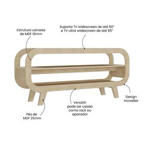 - Indicado para TVs de até 60 polegadas. - Estilo moderno com curvas: Design arrojado que adiciona um toque contemporâneo à qualquer sala de estar. - Funcional e estiloso: Combinação perfeita entre forma e função para atender às necessidades modernas. - Prateleira para organização: Ideal para exibir objetos decorativos ou dispositivos eletrônicos adicionais. - Espaço inferior amplo: Perfeito para organizar equipamentos, caixas ou acessórios. - Atemporalidade e versatilidade: Adapta-se facilmente a diferentes estilos de decoração. - Qualidade e durabilidade: Fabricado em MDP/MDF com pintura UV, garantindo longevidade.