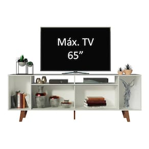 O tamanho é ótimo, comportando TV de até 65 polegadas. Possui nichos de espaços variados, entre abertos e fechados. Assim, cabe tudo de maneira organizada, desde aparelhos eletrônicos até objetos de decoração, livros e revistas.
