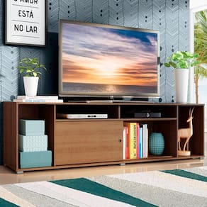 Possui um tamanho ótimo e comporta TV de até 65 polegadas. Conta com uma porta de correr que permite fechar o lado esquerdo ou direito da abertura central. Além disso, são vários nichos de tamanhos diferentes. Assim, cabe tudo de maneira organizada, dos aparelhos eletrônicos até objetos decorativos, livros e revistas.