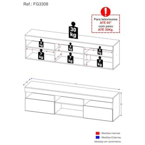 Dimensões do produto montado: Altura: 48cm | Largura: 175cm | Profundidade: 35cm *Devido as variações de tamanho dos televisores no mercado, sugerimos que verifique as medidas da sua TV e compare com o rack antes de efetuar a compra. *Você pode consultar as medidas internas na imagem técnica do produto.