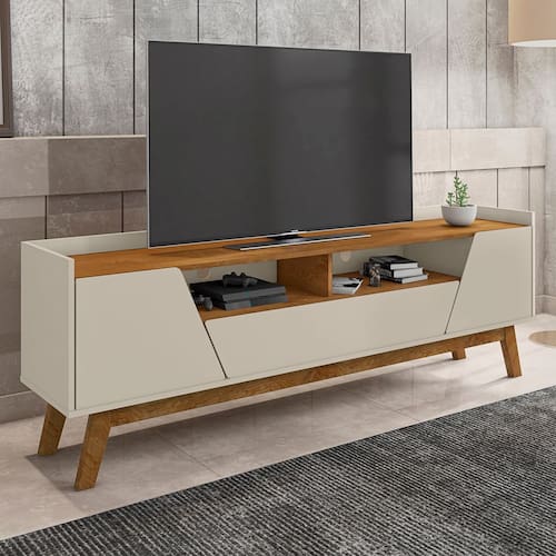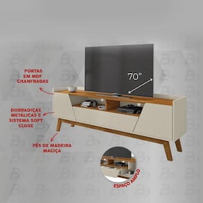 O Rack Florença possui design marcante que mescla linhas diagonais em suas portas chanfradas em ângulo com dobradiças como sistema softclose, Gavetas com corrediças metálicas e pés de madeira maciça, proporcionando design retrô e distinto! Possui uma prateleira e dois nicho que são ideia para acomodar os mais variados tipos de aparelho eletrônicos que complemente sua TV, bem como vários tipos de objetos de decoração.