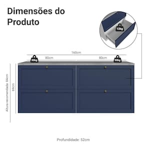 O acabamento de alta resistência da estrutura é em Branco e das frentes em Azul, possuindo uma textura suave ao toque. O destaque fica por conta dos puxadores ponto em ouro envelhecido, feitos com metal resistente, trazem personalidade e um charme único. O detalhe chanfrado das frentes forma molduras delicadas e atemporais.
