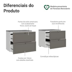 O acabamento de alta resistência da estrutura é em Branco e das frentes em Cinza, possuindo uma textura suave ao toque. O destaque fica por conta dos puxadores ponto em ouro envelhecido, feitos com metal resistente, trazem personalidade e um charme único. O detalhe chanfrado das frentes forma molduras delicadas e atemporais.