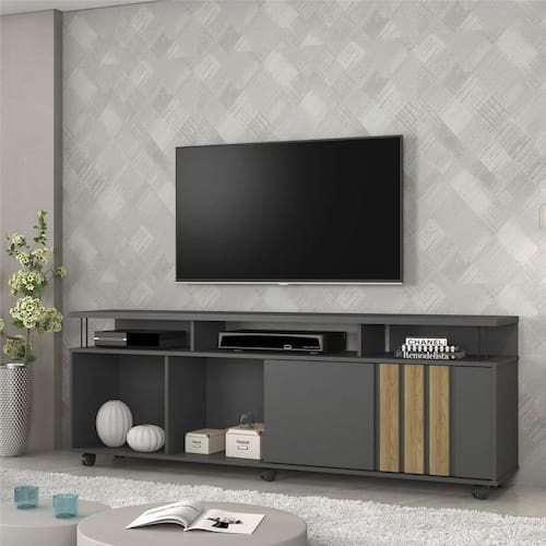 Beleza e design são as características do rack atraente. Possui rodízios aparentes, porta de correr com detalhe ripado, nicho para eletrônicos e tubos em detalhe. Organização e praticidade para deixar seu ambiente mais lindo e aconchegante. Acabamento: Pintura UV Acabamento da Porta: Pintura UV Altura: 66 cm calculo: unidade Complexidade da Montagem: Média: pode ser montado por mais de uma pessoa e/ou necessite de maior conhecimento para montagem Cr: Grafite/Noronha Cr do Produto: Grafite/Noronha Cr Interna: Grafite Escala de Brilho: Brilhante Escala de Brilho da Porta: Fosco Ideal para TVs até (Polegadas): 72 Itens Inclusos: 1 Rack, Kit Ferragens e Manual de Montagem. Largura: 182 cm Manual de Montagem e Instalação: https://cdn2.madeiramadeira.com.br/atributo/jcm-moveis/532606-manual.pdf Material da Porta: MDP Material Principal: MDP Necessita Montagem: Sim Origem do Produto: Nacional Peso: 40,7 kg Possui Espelho: Não Possui Possui Gavetas: Não Possui iluminação: Não Possui Pés: Não Possui Portas: 01 Possui Prateleiras: Não Possui Rodízio: Sim Profundidade: 39 cm Recomendações de Uso, Manutenção e Limpeza: Limpar com Pano Umedecido com Água Rodízio com Trava: Não Sistema de Montagem: Parafusos, Cavilhas e Minifix status-cadastro: Aprovado Suporta Até (kg): 30 kg Tamanho: Tipo de Porta: Correr Tipo de Puxador da Porta: Embutido
