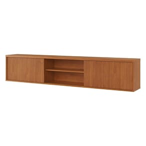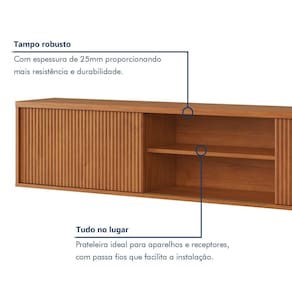 Rack suspenso com visual contemporâneo e acabamento amadeirado que valoriza a sala e deixa o piso livre. O design combina portas ripadas (efeito decorativo e ventilação) com nichos abertos para organizar aparelhos, livros e objetos. Ideal para compor com TV, mantendo tudo alinhado e com aparência clean, além de facilitar a limpeza do ambiente. Perfeito para quem busca praticidade e um toque de sofisticação no dia a dia.