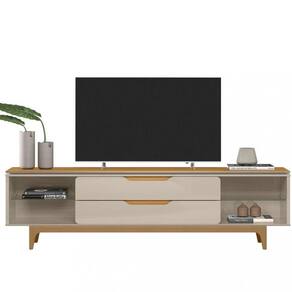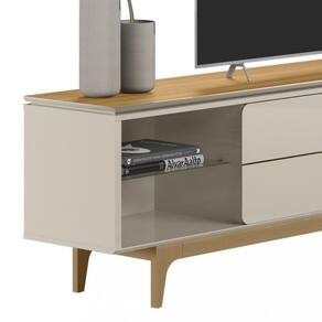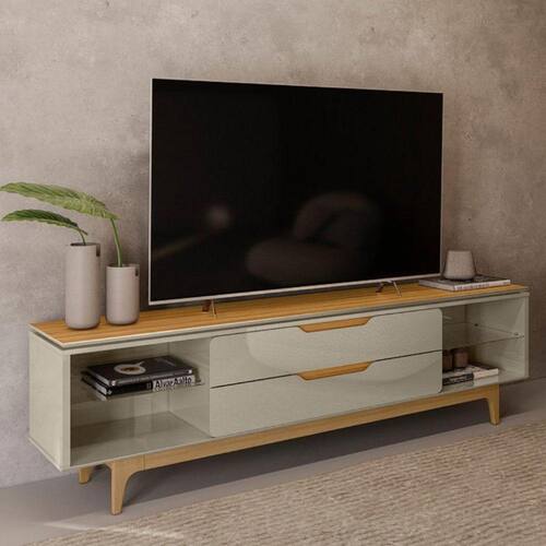 Características: Estrutura em MDP e MDF 2 Gavetas Corrediças telescópicas Prateleira de Vidro Pés em madeira maciça Suporta TVs até 75 polegadas