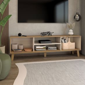 O(a) Rack para TV Até 75 Polegadas Retro 2 Portas Carvalho/Off White - Loja é produzido em MDP na escala de brilho Fosco, e possui um grau de dificuldade de montagem: Médio.