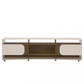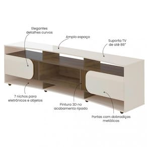 Estilo e espaço se encontram em perfeita harmonia com este rack, ideal para TVs de até 86 polegadas. Ele é o suporte perfeito para o seu entretenimento, proporcionando uma combinação impecável de elegância e funcionalidade. Com amplas dimensões e diversos nichos, você pode organizar seus aparelhos eletrônicos e objetos decorativos sem sacrificar espaço. As duas portas de abrir acrescentam um toque de sofisticação, enquanto os detalhes curvos trazem refinamento ao seu ambiente.
