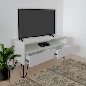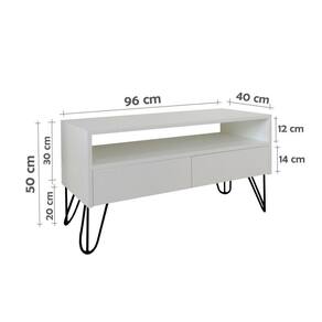 Rack Para Tv Bancada Com Nicho E Gaveta Pés Hairpin Legs Estilo Industrial Off White Laca Móvel charmoso, para deixar seu ambiente ainda mais bonito! Perfeito para compor Dormitórios, Salas e EscritóriosPossui 2 gavetas para guardar o que desejar e nicho para acomodar os aparelhos eletrônicos. Pés em ferro, detalhe que lhe confere um Visual ainda mais Charmoso e Moderno!Na Decoração com Estilo Industrial há sempre espaço para mesclar o rústico com o sofisticado e elegante. Material: MDF Laqueado Gaveta: 02 gavetas com trilhos telescópicos (nicho para aparelhos eletrônicos)Cor: Off White (levemente acinzentado)Pés Hairpin Legs Aço Redondo 3/8Cor dos Pés: Preto Altura: 50 cm (Altura do nicho 12 cm)Largura: 96 cm Profundidade: 40 cm Modelo: Piso Disponível também nas cores: Branco, Preto, Amarelo, Vermelho, Azul e Off White (Consulte nossos outros anúncios)Somos Fabricantes Instalação: Somente é necessário realizar a fixação dos pés. Acompanha parafs para fixação. O produto será entregue Montado. (não realizamos instalação). Conteúdo da embalagem: 01 Rack Atenção: Item composto apenas pelo Rack, itens decorativos NÃO acompanham o produto. Entrega do produto: Não nos responsabilizamos pelo transporte por escadas/elevadores, guincho ou içamento deste produto. Qualquer despesa é de responsabilidade do cliente. Cuidados: Para conservar aspectos e garantir a durabilidade do produto: utilizar pano macio e levemente umedecido. Nunca use solventes ou abrasivos.