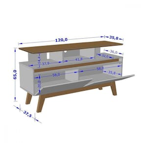 Características: Estrutura em MDF de 15 e MDP de 12 e 15mm Para TV até 50 polegadas (1,20x0,35) Tampo em MDF de 25mm com bordas usinadas em ângulo Acabamento Brilhante Dobradiça metálica 04 Pés em madeira Maciça Suporte de peso 39kg Garantia 03 meses