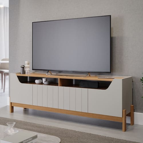 Transforme sua Sala em um Refúgio de Conforto e Estilo. Proporcione uma experiência visual imersiva em entretenimento. Espaço funcional para dispositivos eletrônicos ou decorações, mantendo tudo organizado. Portas com Detalhes, Elegância e personalidade, adicionando charme ao ambiente. Design que Encanta: Combinação perfeita entre funcionalidade e estilo para sua sala. Adapta-se a Diferentes Ambientes: Ideal para salas de estar, oferecendo um toque refinado ao espaço. Qualidade e Durabilidade: Materiais resistentes para garantir a longevidade do móvel. É a expressão de elegância que transformará sua sala em um refúgio de conforto e estilo. Renove seu espaço com charme e funcionalidade! Produto Montado: Sim Acabamento da Porta: Pintura UV Acabamento dos Pés: Pintura Altura dos Pés: 10 cm Ambiente Principal: Sala de Estar codigo_ean: 7909903909034 Complexidade da Montagem: Média: pode ser montado por mais de uma pessoa e/ou necessite de maior conhecimento para montagem Cor: Off White/ Marrom Cor do Produto: Off White/ Marrom Cor Flex: NÃO Cor Interna: OFF WHITE Escala de Brilho: Fosco Escala de Brilho da Porta: Semi-Fosco Ideal para TVs até (Polegadas): 70 Itens Inclusos: 01 BANCADA PARA TV DE ATÉ 70 POLEGADAS Linha ou Coleção: PER2024 Manual de Montagem e Instalação: https://product-hub-prd.madeiramadeira.com.br/938580/documents/45b4253c-e046-46f0-8cfa-783bc5df7bd92301774593517254496473768.pdf Material da Porta: MDP Material do Puxador da Porta: MDF Material dos Pés: MDF Material Principal: MDF Montagem Flex: NÃO Necessita Montagem: Sim Origem do Produto: Nacional Peso: 44 kg Possui Espelho: Não Possui iluminação: Não Possui Nichos: Não Possui Pés: 04 Possui Prateleiras: Não Possui Rodízio: Não Possui Vidro: Não Recomendações de Uso, Manutenção e Limpeza: pano a seco não abrasivo Sapatas Niveladoras: Não Sistema de Montagem: parafusos e cavilhas Suporta Até (kg): 40 kg Suporte de TV Universal Incluso: Não Tipo de Dobradiça/Corrediça da Porta: Metálica Tipo de Puxador da Porta: Externo