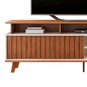 O Rack Flow conta com um tampo robusto, ideal para suportar televisores e outros aparelhos eletrônicos. Sua borda frontal chanfrada é um detalhe que traz um toque contemporâneo e confere um visual sofisticado ao seu espaço. A porta de correr, além de agregar modernidade, permite um melhor aproveitamento do espaço e facilita o acesso aos itens armazenados. Os frisos decorativos presentes na porta dão um toque de estilo e delicadeza, tornando o rack ainda mais atraente.